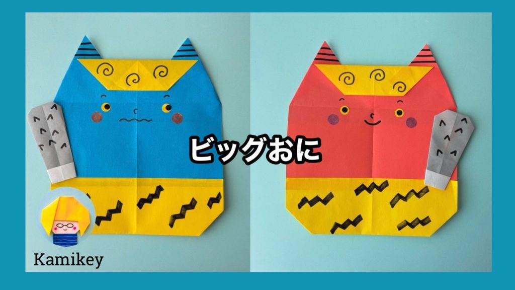 こんにちは。おりがみ作家カミキィです。今回は「ビッグおに」を使った節分の飾りを作ってみました。 15㎝× 15㎝で作ると「ビッグ」になるビッグおにですが、7.5㎝× 7.5…