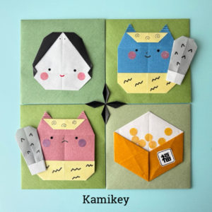 こんにちは。おりがみ作家カミキィです。今回は節分のモチーフを集めて飾りを作ってみました。 節分のモチーフを並べたシンプルな飾りです。ざぶとん台紙を使った飾りは…