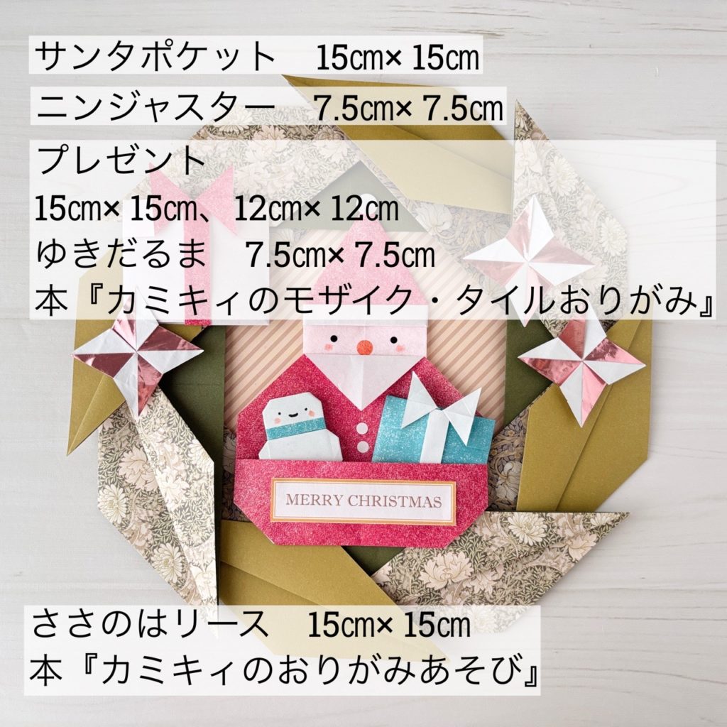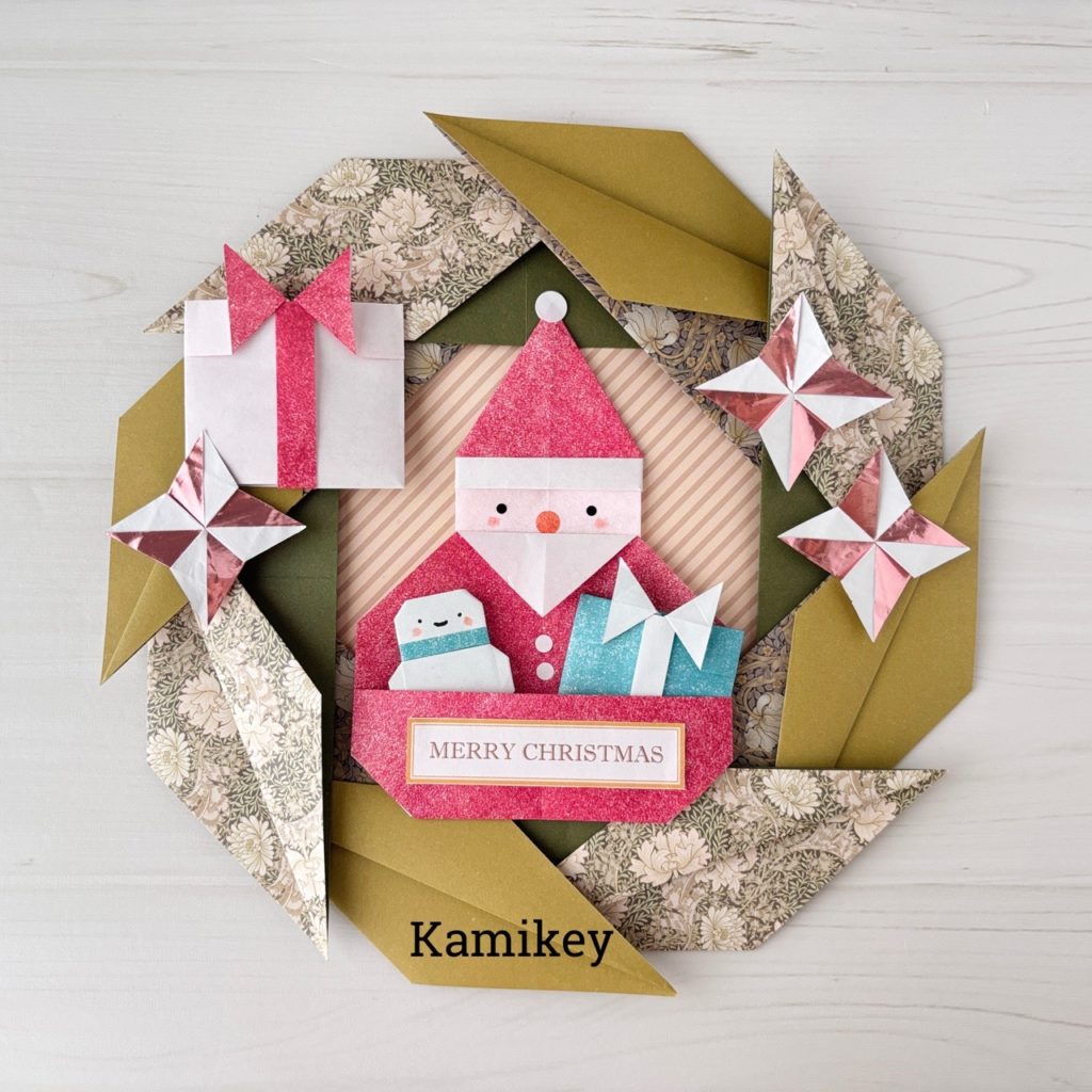 カミキィお菓子などプチプレゼントを入れるために考案した「サンタポケット」ですが、ポケット部分に折り紙モチーフを入れて壁面飾りにも使ってもかわいいです。